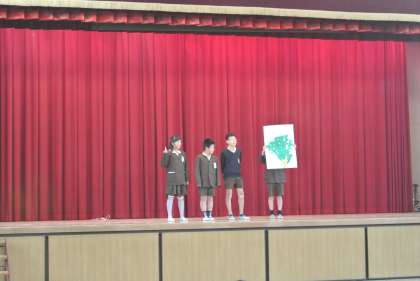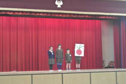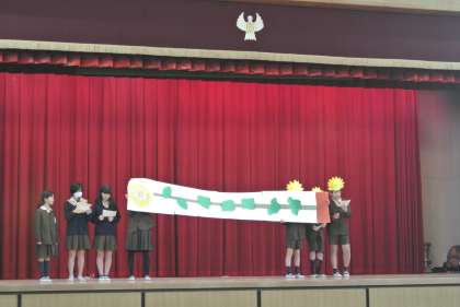 今朝の児童集会は飼育栽培委員会による委員会発表でした。これまでに育ててきた野菜や花についてのクイズをしました。