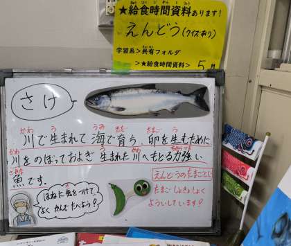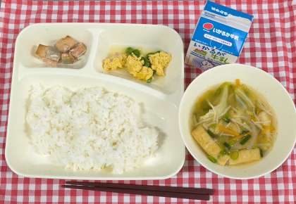 今日は、さけのつけ焼き、五目汁、えんどうの卵とじ、ご飯、牛乳でした。えんどうの卵とじは、卵アレルギーのある子も食べられるように卵除去食を用意しました。