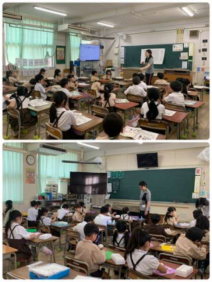 今日は、1年1組の先生が3組の音楽を、1年3組の先生が1組の図工を指導していました。