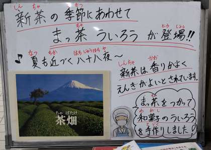 今日は、かやくごはん、みそ汁、まっ茶ういろう、牛乳でした。給食委員会が放送で『茶摘み』を歌って立春から八十八夜にあたる今頃は新茶の季節であることを紹介しました。季節を感じることができる和菓子も給食室で手作りしています。