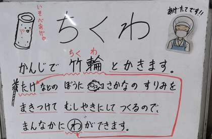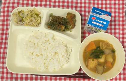 今日は、ちくわのいそべあげ、あつあげとさといものみそ煮、キャベツの赤じそあえ、ご飯、牛乳でした。
