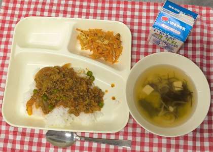 今日は、タコライス、もずくのとろり汁、にんじんのシリシリ風、牛乳でした。タコライスはタコスの具をご飯の上に乗せた沖縄の創作料理です。今日は沖縄料理でまとめました。