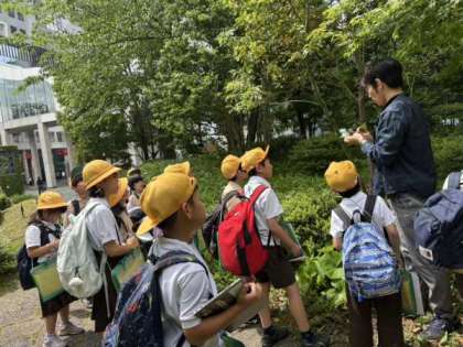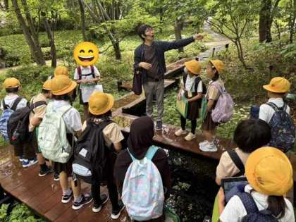 里山で指導員さんからお話を聞いています。