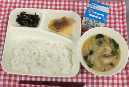 あかうおのしょうゆだれかけ、みそ汁、ひじきのいため煮、ご飯、牛乳でした。赤魚は白身で食べやすい魚です。魚が苦手な子もよく食べていました。