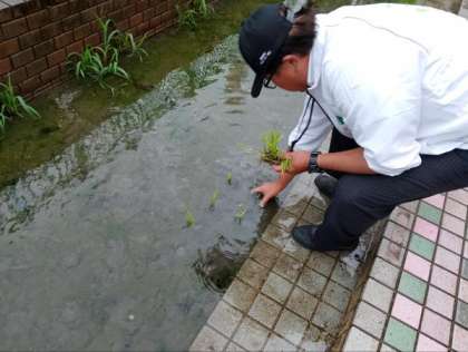 2.大体10cm間隔で、学校の田んぼに植えていきます。