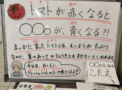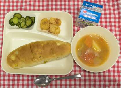 今日は、いかてんぷら、フレッシュトマトのスープ煮、きゅうりのバジル風味サラダ、おさつパン、牛乳でした。クイズの答えは、いしゃ(医者)です。