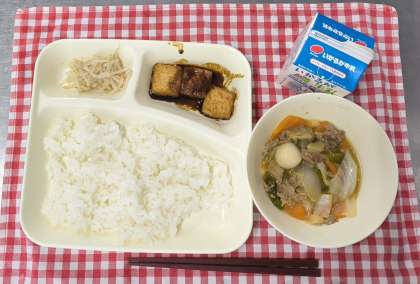 今日は、八宝菜(卵除去食対応)、あつあげの中華みそだれかけ、もやしの中華あえ、ご飯、牛乳でした。