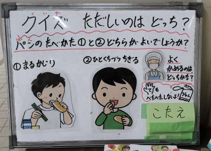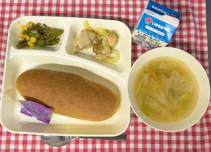 今日は、鶏肉のカレー風味焼き、スープ、ツナとさんどまめのソテー、コッペパン、ブルーベリージャム、牛乳でした。クイズに答えは2番です。