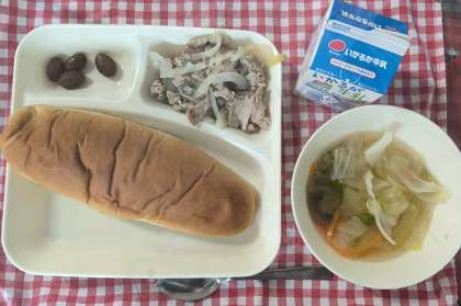 今日は、豚肉のバジル焼き、鶏肉とキャベツのスープ、うずら豆のグラッセ、黒糖パン、牛乳でした。