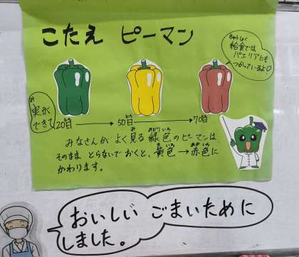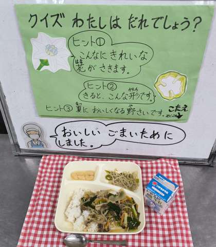 今日は、牛丼、もやしとピーマンのごまいため、大福豆の煮もの、牛乳でした。