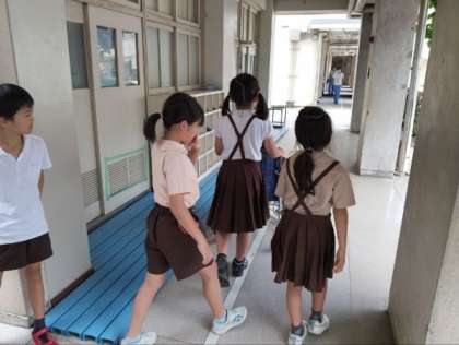 実際に車椅子をおす体験では、グループになって、校内をまわりました。