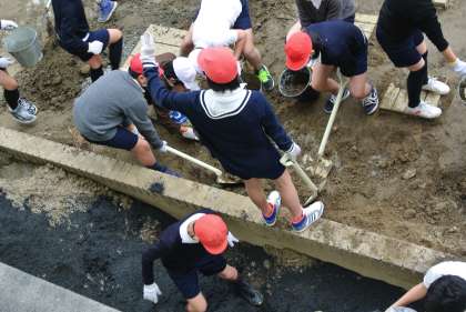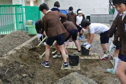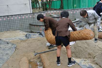 昨日の5-2に続いて今日は5-1と6-1の2クラスが作業を行いました。ヤシのロールで池の輪郭を作り、その周りを土で固めていつたり、燻製のもみがらを花壇に入れたりとたくさんの作業を手際よく行いました。