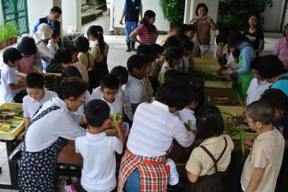 初めに、城北公園事務所の方に、株分けの仕方を教えてもらいました。そして、地域の方にもお手伝いいただき、一人ひとり株を洗い、まとめてしばり、ポットに土を入れて植えました。