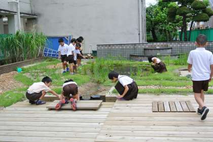 休み時間になるとビオトープに子どもたちが集まってきます。今はトンボが3種類ぐらい飛び交っていますし、蝶やハチも飛んでいます。