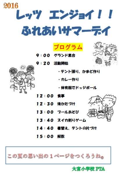 4年生のみなさん、明日は8:45グランド集合です。お米(1合)、水とう、1リットルほどの氷、プールの用意、軍手、タオルなど忘れないでね。