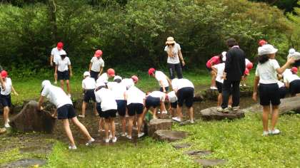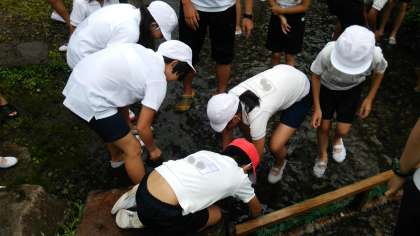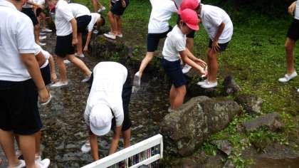山を下りてきて、プログラムは魚つかみに移りました。宿舎の裏の川で魚をつかえます。魚はあまごです。川の水はとても冷たいです。しびれるくらいです。