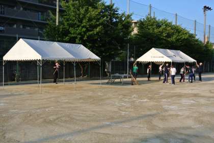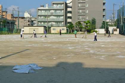 今日の放課後、教職員で第2グランドのにがりまきをしました。運動会をより安全に行うための運動場の整備です。