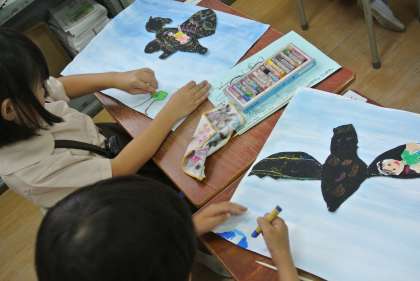 まほうのとりをスクラッチで表現し、そのとりから旅のチケットが届いたことで、とりと一緒に旅をするというストーリー性のある題材です。ストーリー性をもたせることで、子どもたちの興味や関心を引き起こし、意欲的に取り組めるのではないかと考えました。