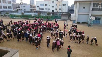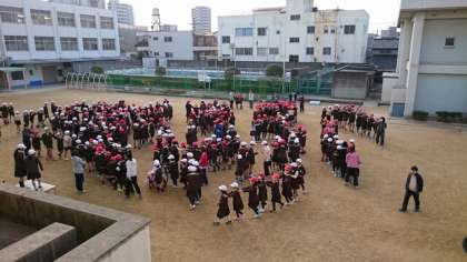 寒い朝の運動場に、集会を楽しむ子どもたちの声が響きました。