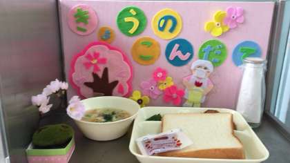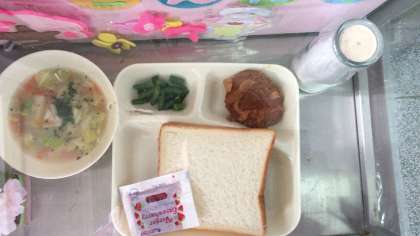 煮込みハンバーグ、コーンスープ、食パン、イチゴジャム、牛乳です。給食調理員さんが心を込めて作ってくださっています。