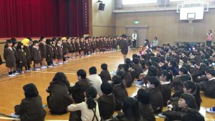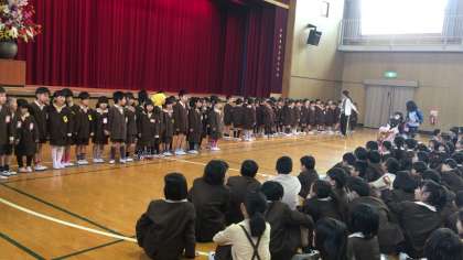 74名が入場しました!6年生の代表児童が、歓迎の言葉を述べました。しっかり聞いている1年生!