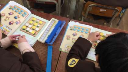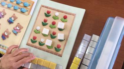 ブロックを使って学習をしています。教科書の赤い花と白い花の上にブロックをのせて、どちらが多いか調べています。