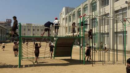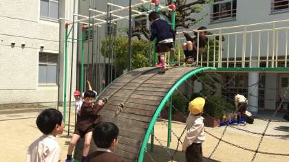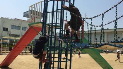 今日はよく晴れて暑いくらいです。運動場の総合遊具で元気に遊んでいます。