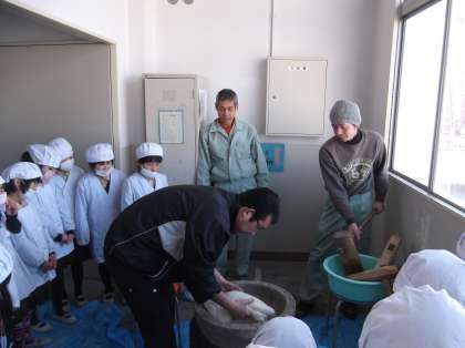 2月5日(水)。少し遅くなりましたが、3年生が「餅つき」を体験しました。初めて見る、臼や杵。珍しそうに見る子どもたち。中には「怖い」と言って後ずさりする子も。担任の先生も手伝って、全員が「餅つき」を体験できました。教室に帰ってからは、砂糖醤油や黄粉を付けておいしくいただきました。また、翌日は「七輪体験」。炭から火をおこし、お餅を焼いて食べました。
