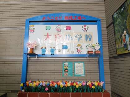 ますは、「鶴見ごみ焼却工場」へ。焼却工場の係の人たちに出迎えられ、記念のクラス写真をパチリ。そして、3つのグループに分かれて工場内を見学しました。