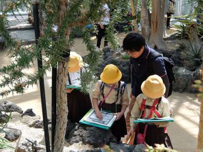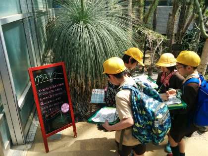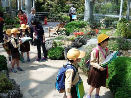 そして、お弁当を食べて、今度は「咲くやこの花館」へ。グループに分かれてクイズラリーをします。どのグループも協力し、係の人にも聞きながらクイズの答えを探していました。世界の花と緑について学習することができました。