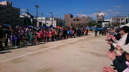 町内会ごとに、入場行進が始まりました。大人も子どもも元気に行進しています。