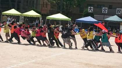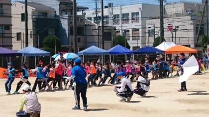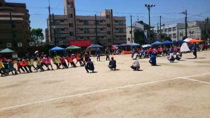 白熱の綱引き大会、子どもの部です。町会ごとに男女3人ずつ参加すると、かなりの大人数になります。力いっぱい綱を引く真剣な表情がすてきです。