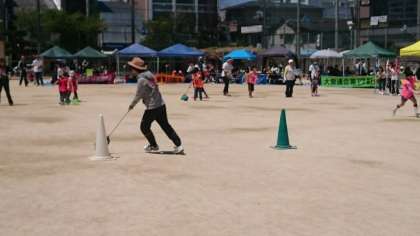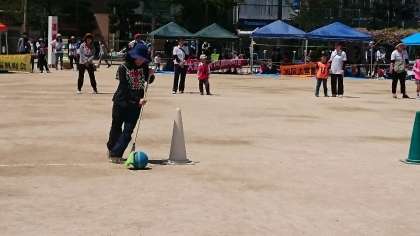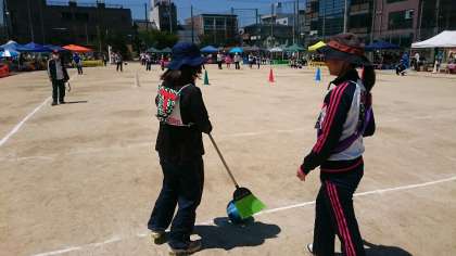 ほうきでポン!はほうきでドッジボールを転がす競技です。小さい子から大人まで楽しめます。学校職員も参加しました。