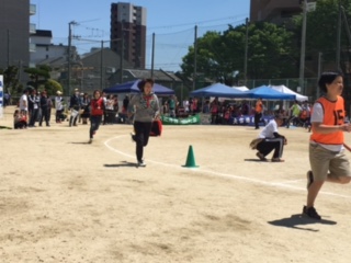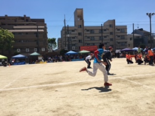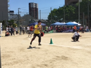 午前最後の競技は紅白リレー(予選)です。フィナーレの本選にむけて、紅白リレーの予選を行いました。町会ごとに子ども3人、大人3人が出場します。生き残れるかどうかは代表メンバーの力走にかかっているので、応援も自然と熱くなります。オープン参加で職員も参加させていただきました。