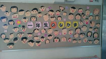 先日1年生が図画工作の時間に描いていた絵が、廊下にはりだされています。どの顔もしっかりとパスで色を塗り込み、なかなかの力作ぞろいです。水曜日の参観日にどうぞご覧ください。