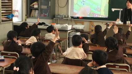 教科書の絵を見て話をしました。誰が、何をしているのかなど、想像して話をしました。友達の意見を聞いて、また違った考えが浮かび、次々手をあげて発表したくなる1年生です!