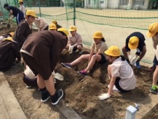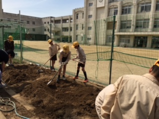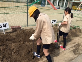 ジャガイモとホウセンカを植えるために、学習園を耕しました。日当たりが良いのでたくさん収穫できそうです。「ジャガイモで、ポテトチップスをつくりたい!」そうですよ。