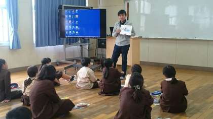 授業の導入はスポーツフォニックスです。スポーツの種目に関する単語のスペルを意識しながら先生のお手本ををよく聞き、ネイティブに近い発音ができるように何度も練習しました。