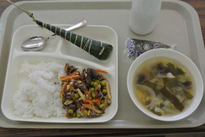 「子どもの日の行事献立」ということで、今日の献立は、牛肉のちらしずし、すまし汁、ちまきでした。