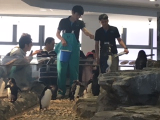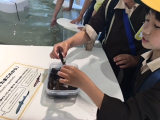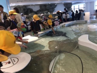 4階の体験コーナーでは、サメやエイにタッチ!「ヌルヌルしてた!」「ちょっと怖かったけど、おもしろかった!」と子ども達。ペンギンの餌やりや、「魚の顏博」なども楽しみました。