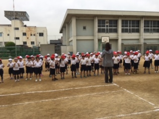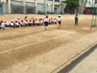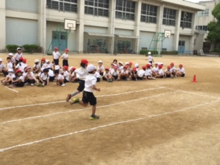 50mを走りました。力いっぱい走って汗がどっと出ました。スポーツテストでは、タイムも測ります。周りの子ども達もしっかり応援しています。