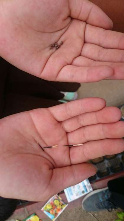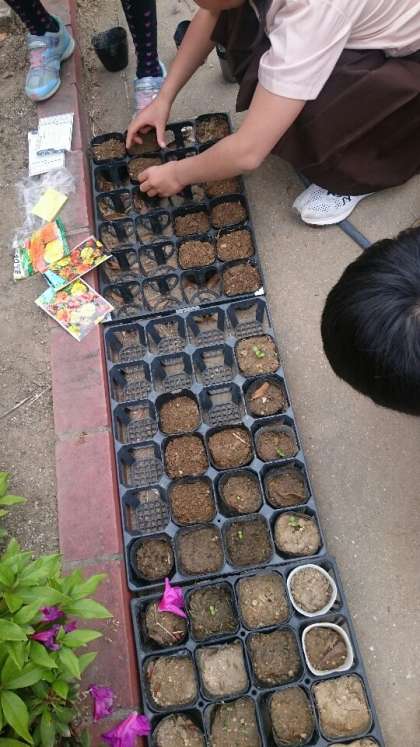 3年生が学習園でたねをまいていました。マリーゴールドとホウセンカを育てるそうです。どちらがどのたねか、わっかるかな〜?