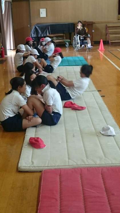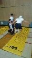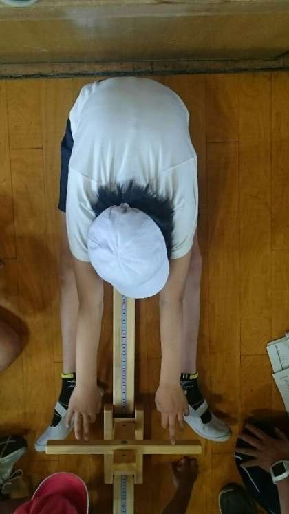 体育館でもいろいろな種目が測定されています。画像は立ち幅跳び、上体起こし、長座体前屈の測定の様子です。瞬発力、筋力、持久力、柔軟性など多くの運動能力が試されています。さあ、結果はいかに!?
