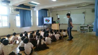 先生の自己紹介や母国の料理などについて、お話を聞きました。もちろん英語で!ふだんの英語タイムでは聞けないネイティブの発音をしっかり体感することができました。「子どもたちはとってもパワフル!」先生の感想でした。