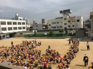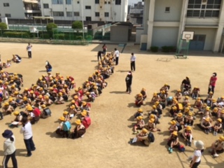 各町会ごとの話し合いが終わると、全員運動場に。いきいき活動やキッズ教室に参加する子は残り、他の子ども達は、担当の先生が付き添って下校しました。歩き方、危険な箇所はないかなど確認しながら帰りました。