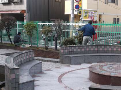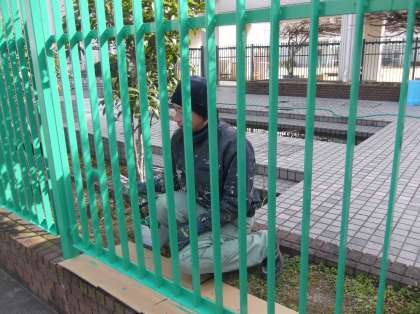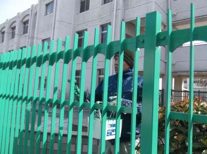 式が晴れやかになるように、管理作業員さんたちは、外柵を鮮やかな緑に塗り替えて、卒業生を送り新入生を迎える準備をしています。
