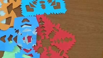 どの子も集中してハサミを使っています。線にそって、ていねいに切れています。また折り紙を折って切り目を入れたら…、開いたときにはすてきな模様がたくさんできました。