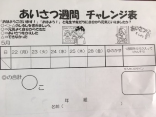 今週は、あいさつ週間。朝の会で点検をしています。いつも大きな声であいさつできているかな?