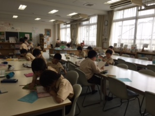 図書室前に、きれいに上靴が揃えられています。中を覗くと、4年生が、思い思いのスタイルで読書を楽しんでいました。