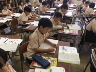カタカナで書く言葉について考え、たくさん言葉集めをしました。音や鳴き声、外国から来た言葉、外国の地名、人の名前などです。「国旗の本を見ながら、たくさんの国の名前を自由勉強で書きたい」とうれしそうに話す子もいました。一文字一文字、ていねいに書いています。
